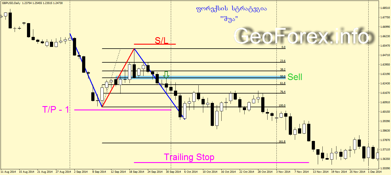 წრფეს ვავლებთ მოძრაობის პირველი ტალღის დასაწყისიდან დასასრულამდე. მიმმართველი ტალღის შემდეგი ტალღის (მეორე ტალღა) შუა წერტილი არის სასიგნალო ადგილი სადაც ვხსნით პოზიციას. შუა წერტილის დასაფიქსირებლად შეგვიძლია გავავლოთ ფიბონაჩის ინდიკატორი და მისი 50% იქნება სწორედ სასიგნალო დონე. მიღებული დონე იქნება გარღვევის დონე, რომლის გარღვევისა და ქვევით ან ზევით სანთლის დახურვა მოგვცემს სავაჭრო პოზიციის გახსნის სიგნალს.